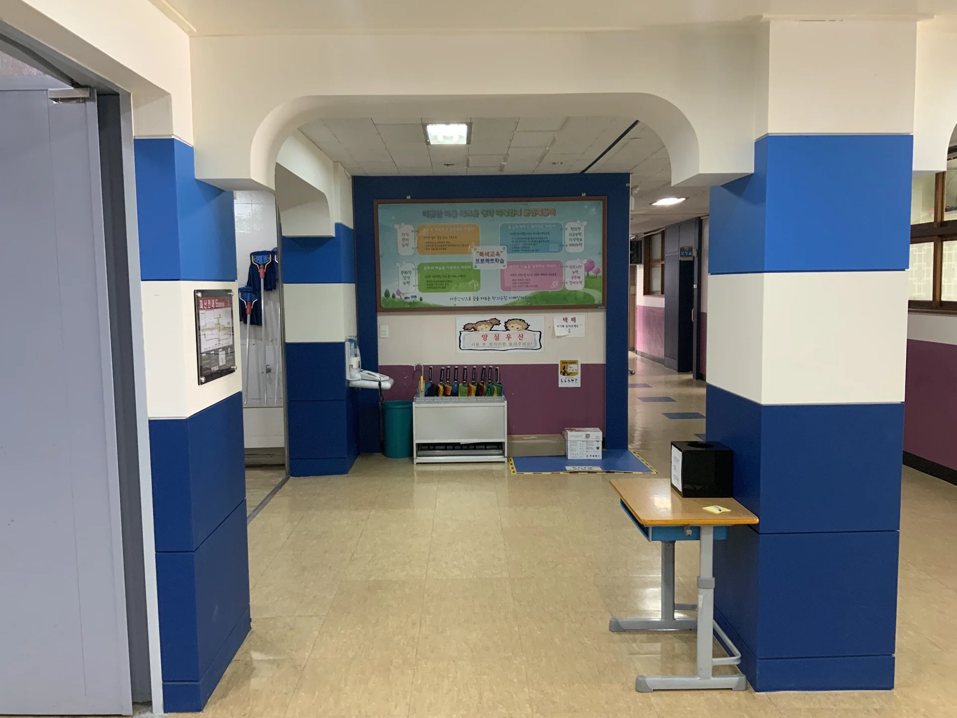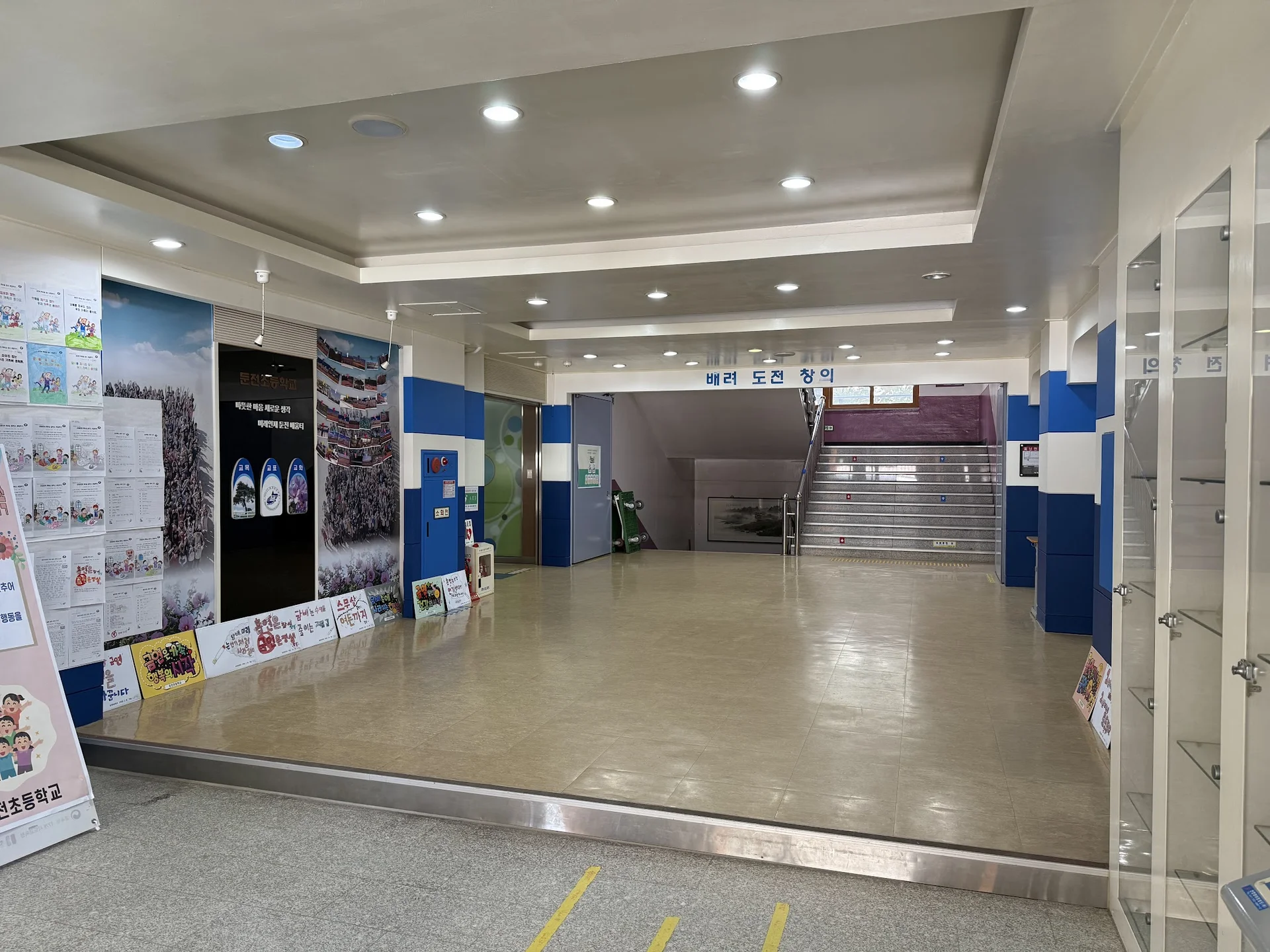 둔전초등학교 1층에 들어서면 가장 먼저 눈에 띄는 것은 왼편에 자리한 디지털 갤러리 공간입니다. 이 공간은 학교 전반에 걸친 흰색과 푸른색 톤의 이탈리아 산토리아풍 인테리어와 어우러져, 스크린 주변에 마치 초록빛 잔디가 깔려있는 듯한 자연스러운 조화를 이루도록 구성하였습니다.