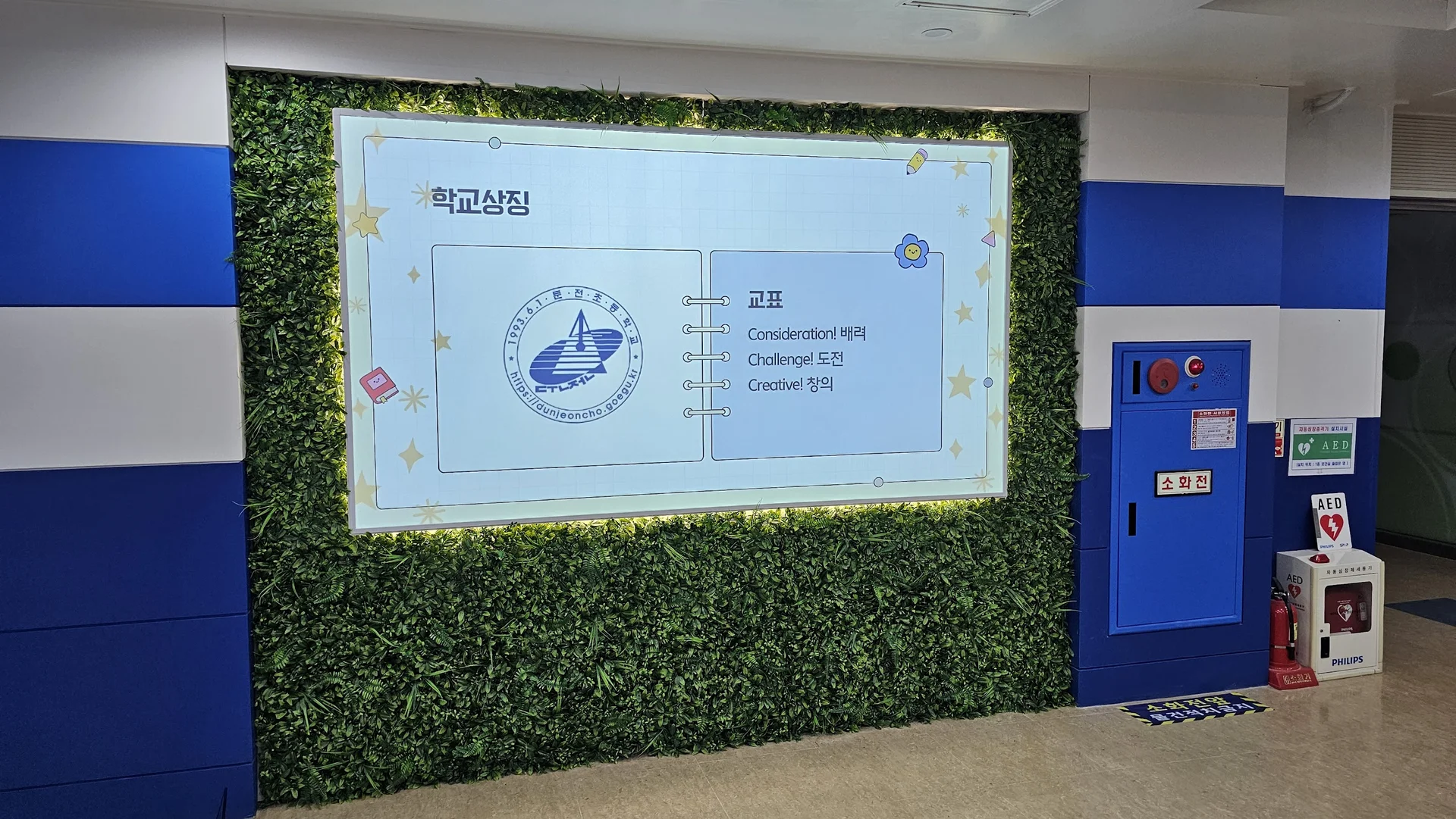 디지털 스크린이 단지 화면 표현 도구에 그치지 않고, 공간 디자인의 일부가 되는 점도 주목할 수 있습니다. 스크린페인트를 활용하면 벽면 전체를 하나의 문화·학습 공간으로 확장할 수 있으며, 주변 인테리어와 자연스럽게 어우러져 교육 공간의 품격을 한 단계 높여줍니다. 둔전초등학교 1층의 디지털 갤러리와 스크린은 주변의 푸른빛과 하얀 벽면, 그리고 초록빛 잔디 마감으로 이루어진 인테리어와 자연스럽게 어우러져 차분하고 몰입감 있는 분위기를 조성할 수 있었습니다.