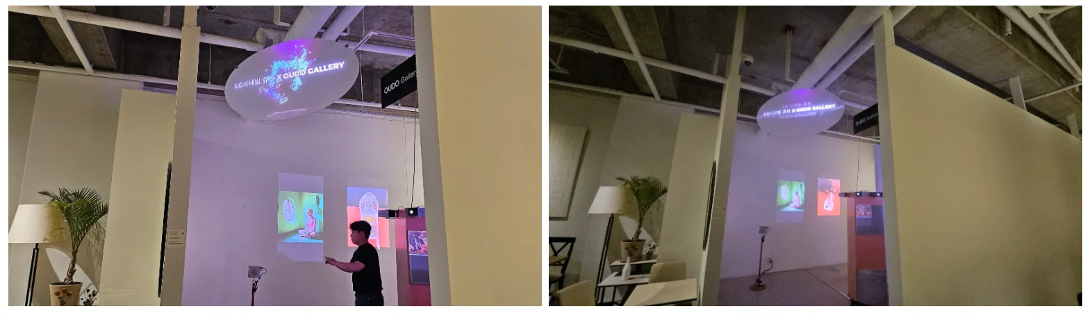 성수동 카페 OUDO에서 6인의 대표작품을 원화가 아닌 LG시네빔 프로젝터와 스크린페인트를 활용하여 전시되었습니다. 좁은 공간의 여러 빔프로젝터를 설치하기 위한 조형물 활용과 비정형의 스크린을 통해 카페의 인테리어와 조화로운 갤러리를 연출하였습니다.