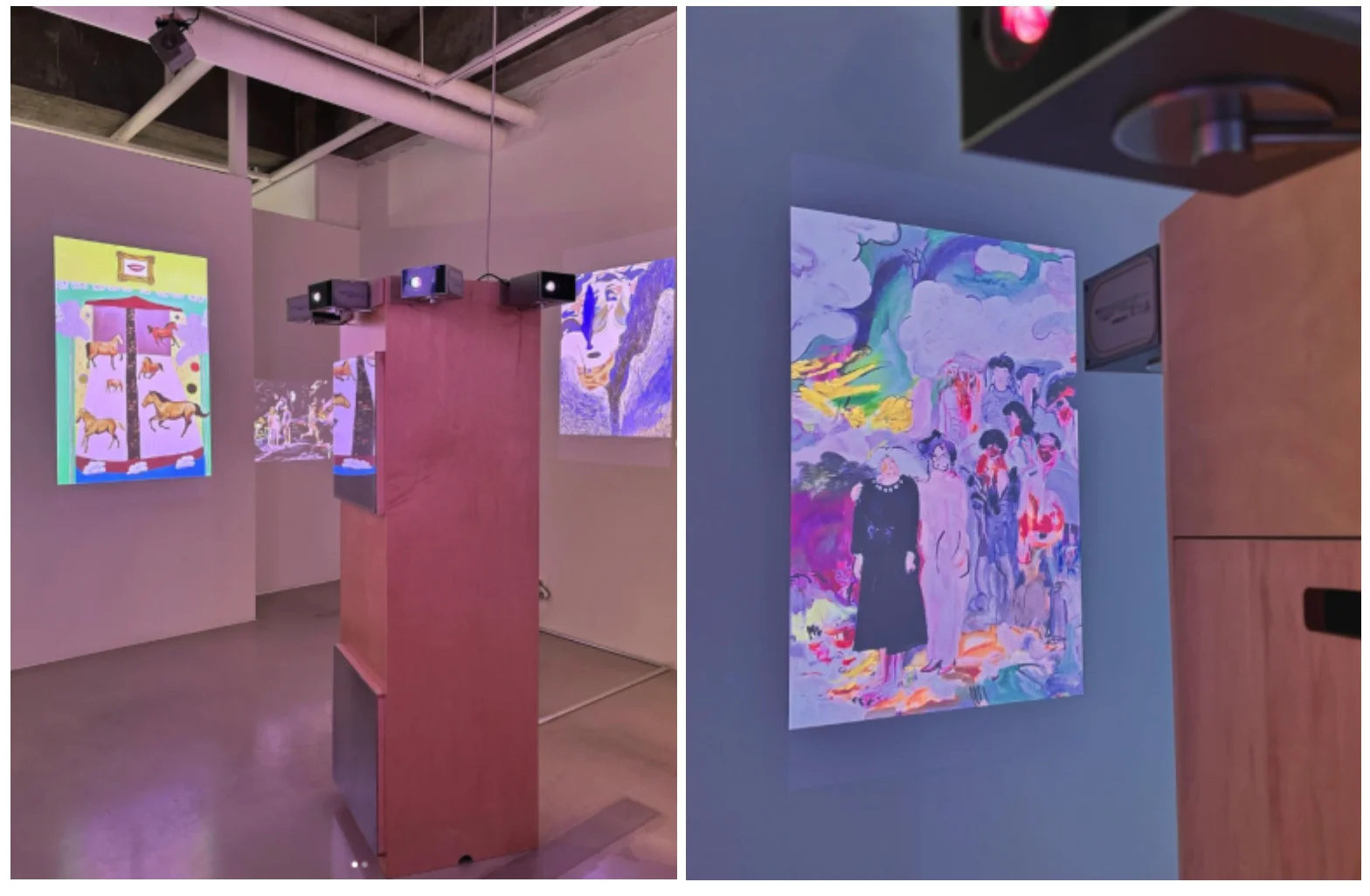 이를 해결하기 위해 우드 조형물을 활용한 설치 방법을 고안하였습니다. 덕분에 우드 조형물이 갤러리 인테리어의 자연스러운 분위기를 살리면서도 프로젝터를 안전하게 고정해주어서, 관람객들은 편안하고 안정적인 분위기에서 작품을 감상할 수 있었습니다.