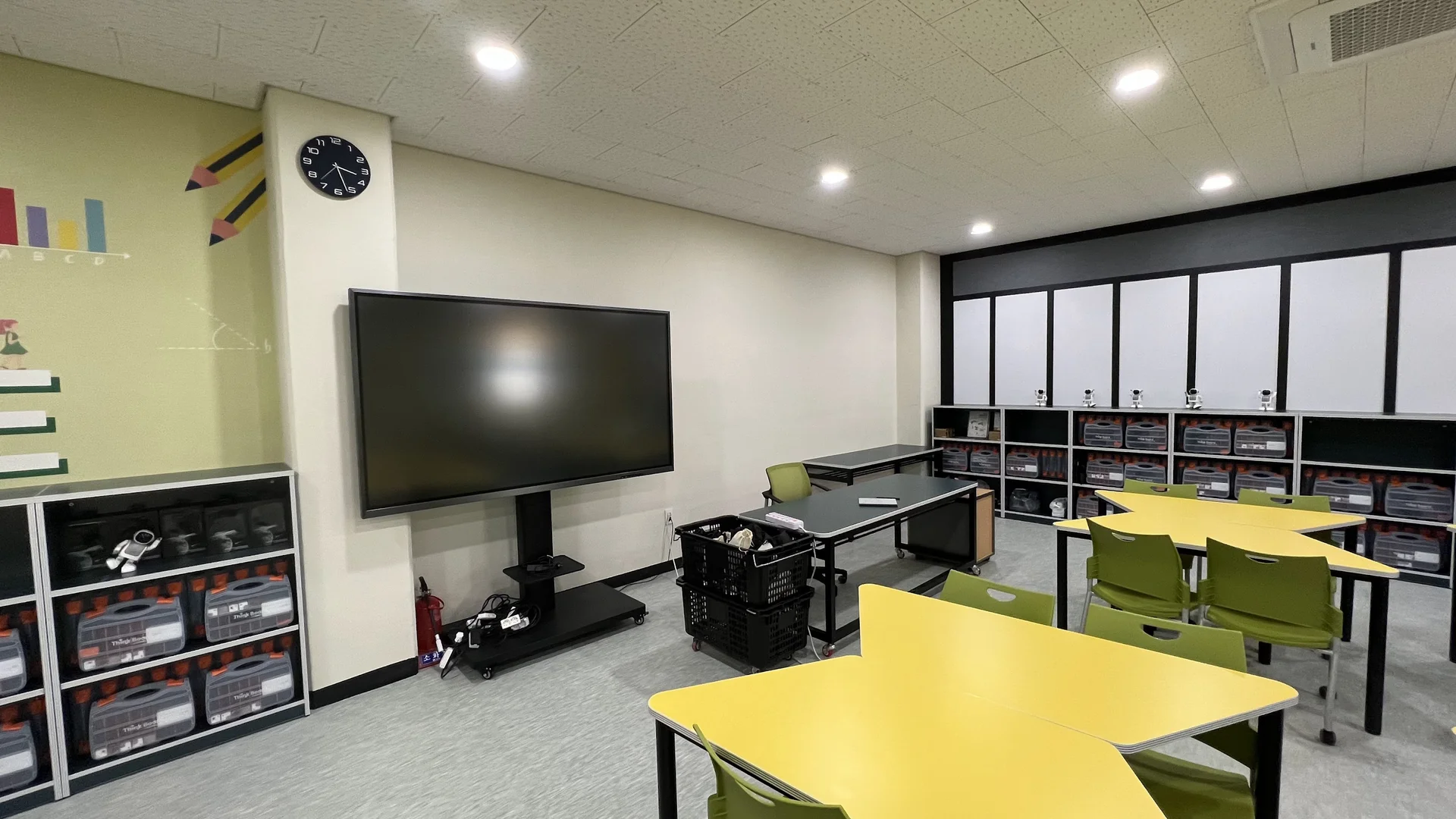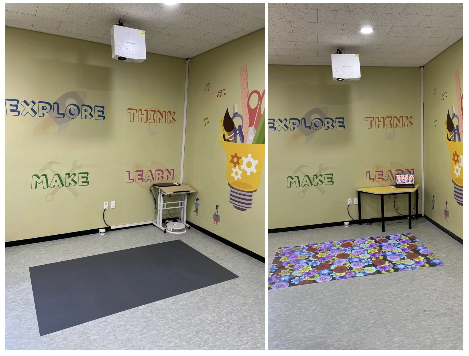 벽면 전체를 스크린페인트로 도포하고, 인테리어를 통해 디지털 교실의 목적성을 나타내도록 했다. 벽면을 모두 채우지는 못하지만 IR센서를 설치하여 인터랙티브 콘텐츠를 사용할 수 있는 환경을 만들었다.