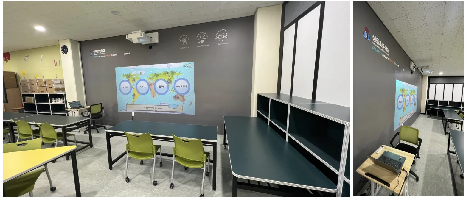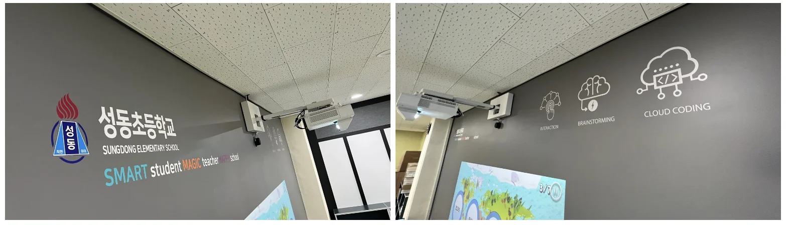서울 성동초등학교의 디지털 교실에는 스크린페인트와 IR센서로 만들어진 터치가 가능한 대형 벽면 스크린과 바닥 스크린이 설치 되어 있습니다.