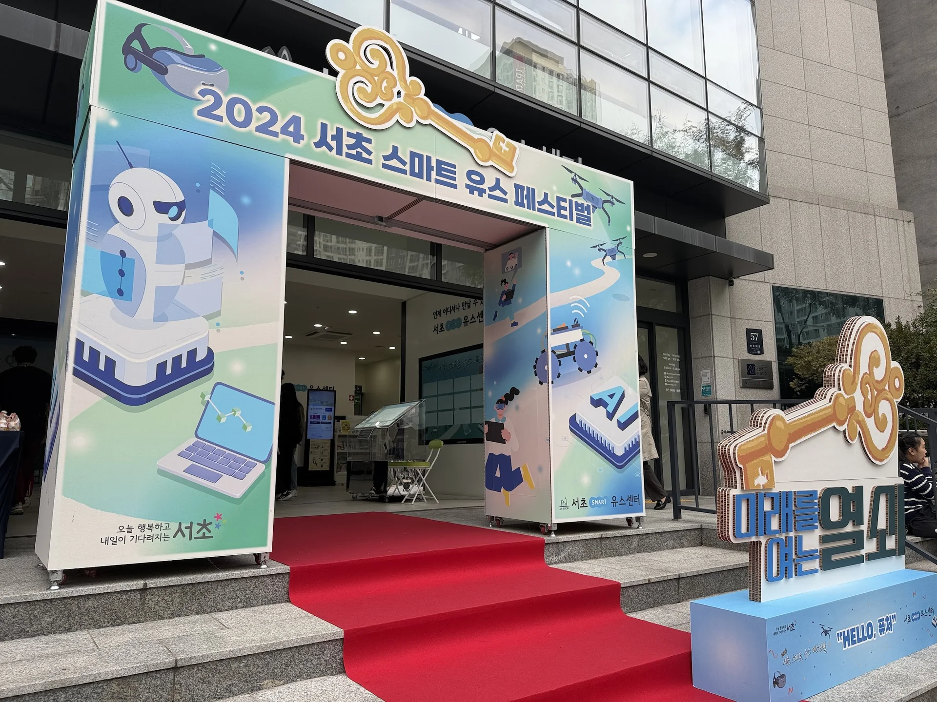 서초 스마트유스 페스티벌 행사장에 들어서면 큰 간판과 함께 펼쳐진 레드카펫이 가장 먼저 눈에 들어온다. 행사장 입구부터 방명록이 있는 공간까지 이어져 있는 레드카펫은 자연스럽게 방문객들의 동선을 유도하는 동시에 특별한 행사에 참여하는 경험을 전달한다.