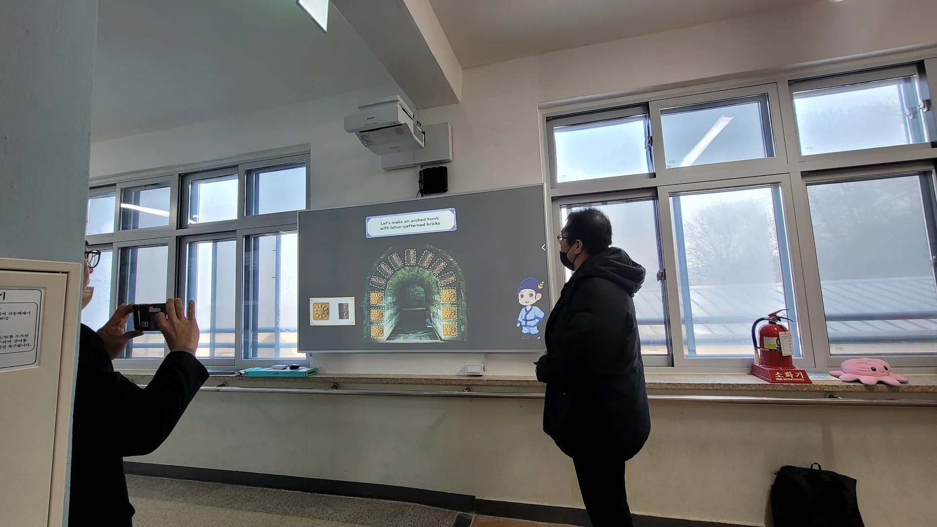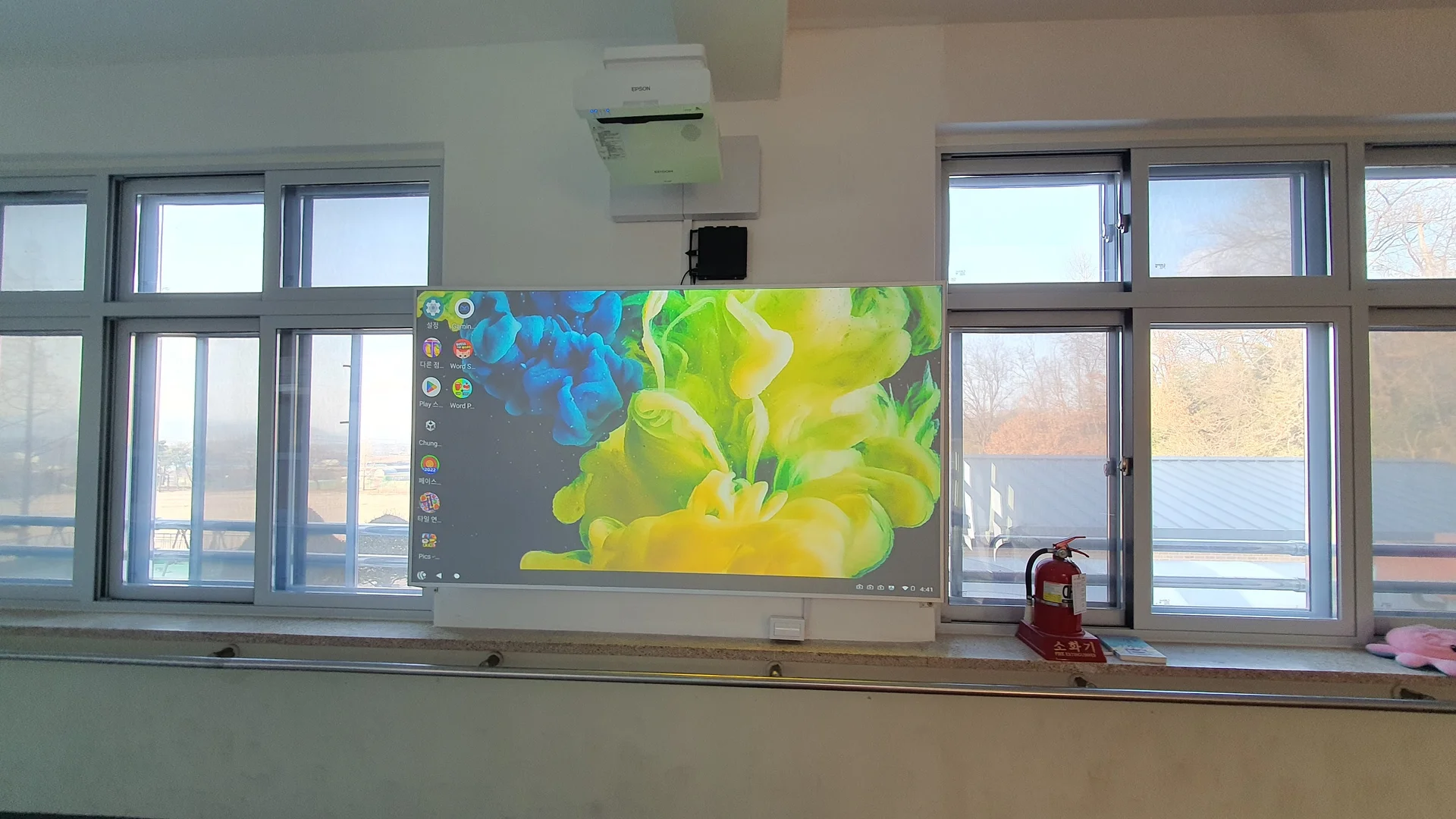 초등학교의 평범한 복도에 만든 베젤이 없는 인터랙티브 스크린